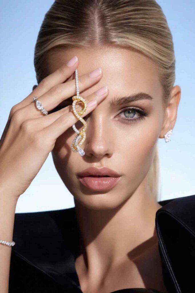 Zona de beauty este unul dintre cele mai bune teritorii pentru modelele virtuale AI. Aici contează enorm detaliul: pielea, expresia, poziția mâinii, integrarea bijuteriei, raportul dintre chip și produs.