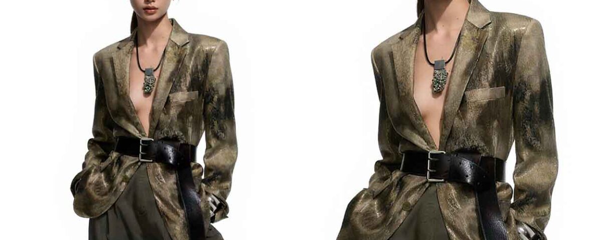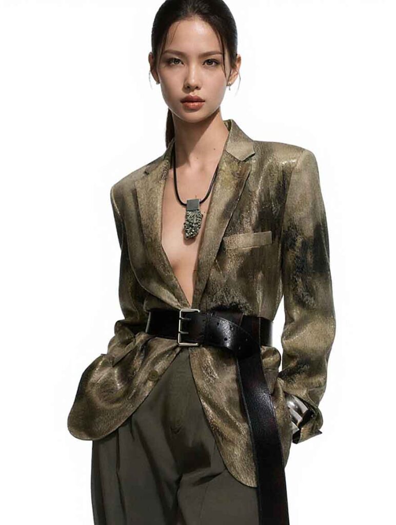 Primul exemplu de studio cu Mei merge într-o zonă mai fashion-forward: sacou metalic, centură lată, fundal neutru și o compoziție curată, dar cu atitudine.