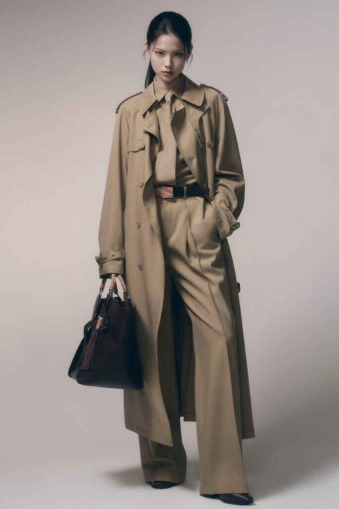 Look-ul cu trench taupe este poate cel mai apropiat de un vizual de campanie ready-to-wear: paletă calmă, siluetă elegantă, geantă structurată și un fundal suficient de curat pentru utilizare reală într-un context comercial.