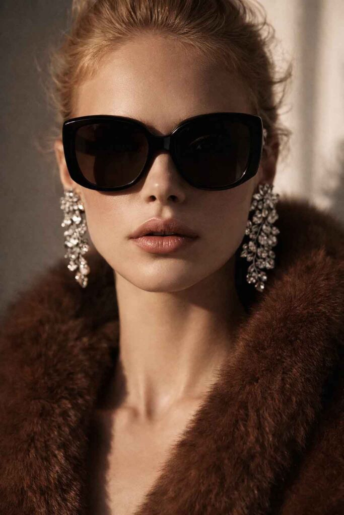 Portretul cu Wanda arată o altă versiune a aceleiași zone: mai fashion, mai luxury, mai puternic ca atitudine. Aici beauty-ul se apropie de zona de accesorii premium, eyewear și luxury editorial.